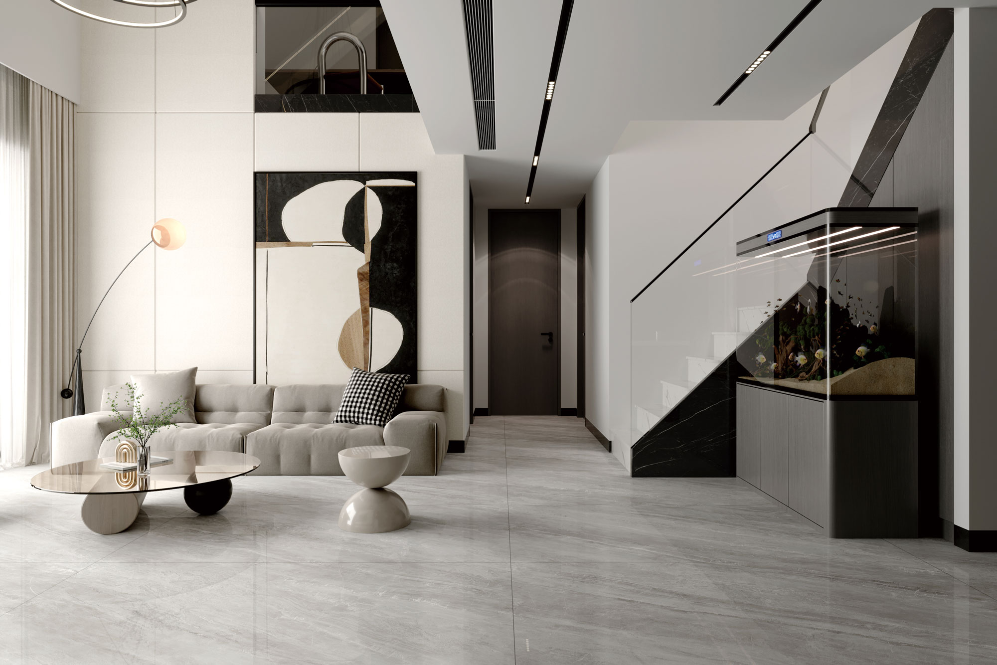 以茫茫天際般的灰白為磚底,出其不意間的鎏光紋理,彰顯個性不凡,打造磅礴大氣的空間美學。
