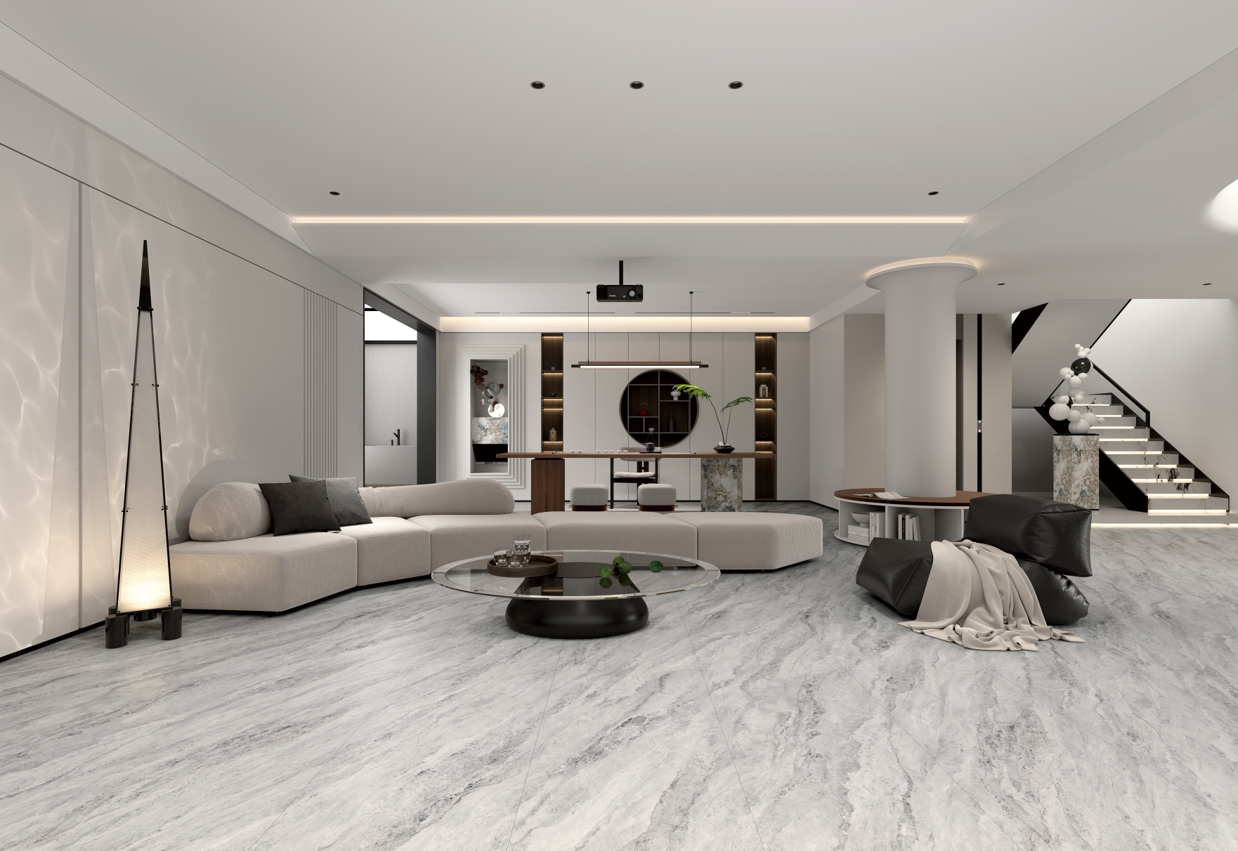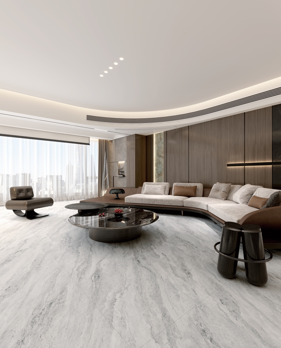 剛柔并濟的灰色和凹凸立體的肌理質感,在光影交錯中更顯層次豐富;細膩交織的白色石紋悠然貫穿于灰色基底之上,與灰調自然相融,宛如清澈溪流輕盈穿梭于石隙之間,靈動而寧靜。