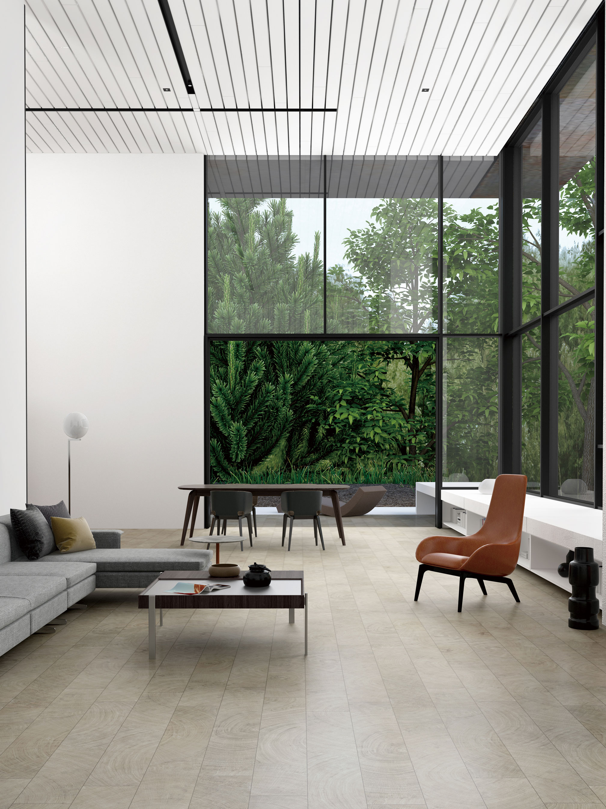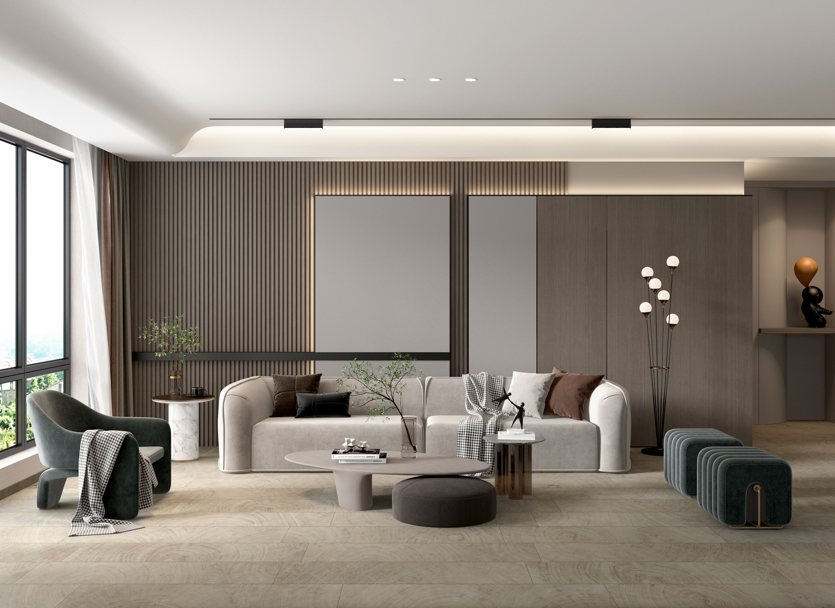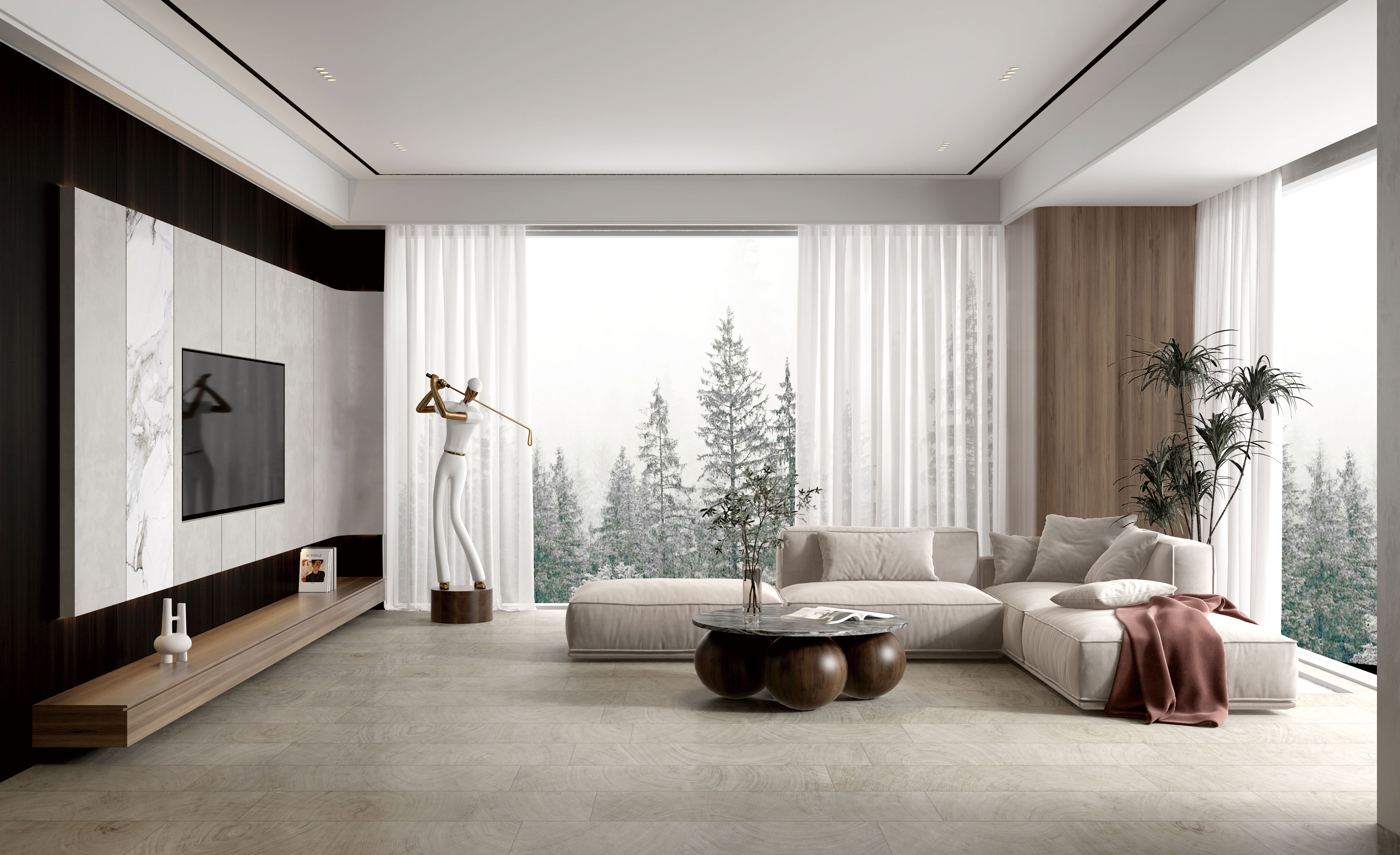 靈感源于處于不同經緯度生長的樹木,進行橫向切割所呈現的原木色年輪紋,并將不同種類的樹木進行二次創作,打造出獨一無二的木紋產品,營造雅致的茶室空間。