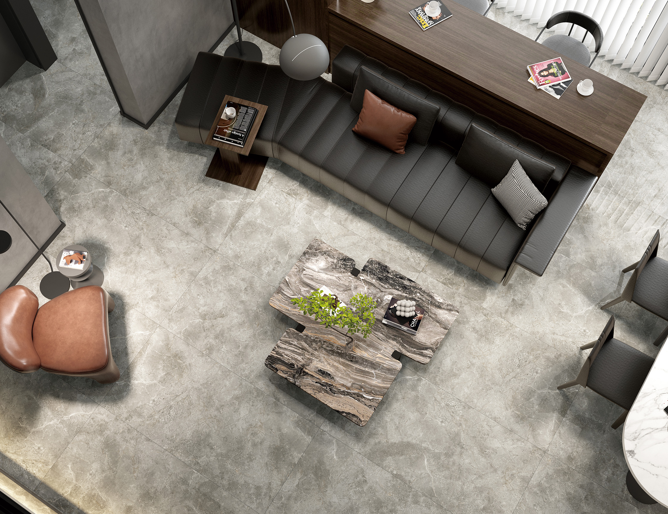 卡基諾灰,遍布粗糲的原石顆粒,層次立現,承載悠遠時光感的黑色細紋在磚的表面盛放,訴說著大理石億萬年自然演變的原始記憶。一石滿足多種應用需求,即可以高調奢華也可以低調優雅,裝點出簡約時尚的生活空間。