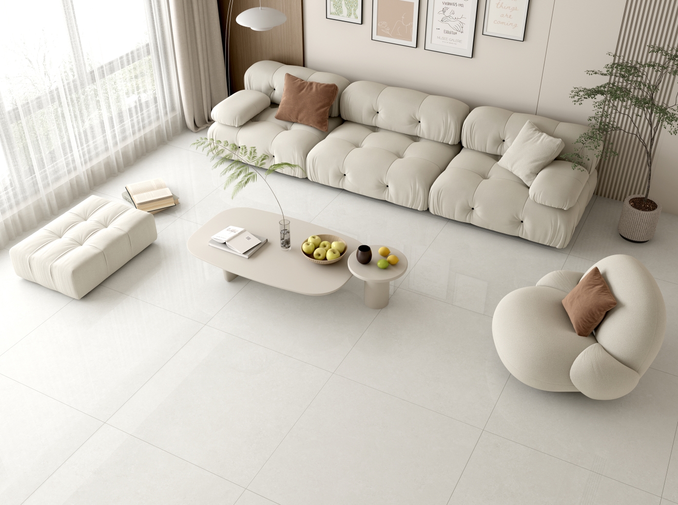 唯美再現大自然中,山峰氤氳在云海里的勝景。灰色底磚,隨機呈現的微小紋理或交織、或貫通之下,沒有多樣的繁復紋理,就已傳達出匹配現代調性的美感。